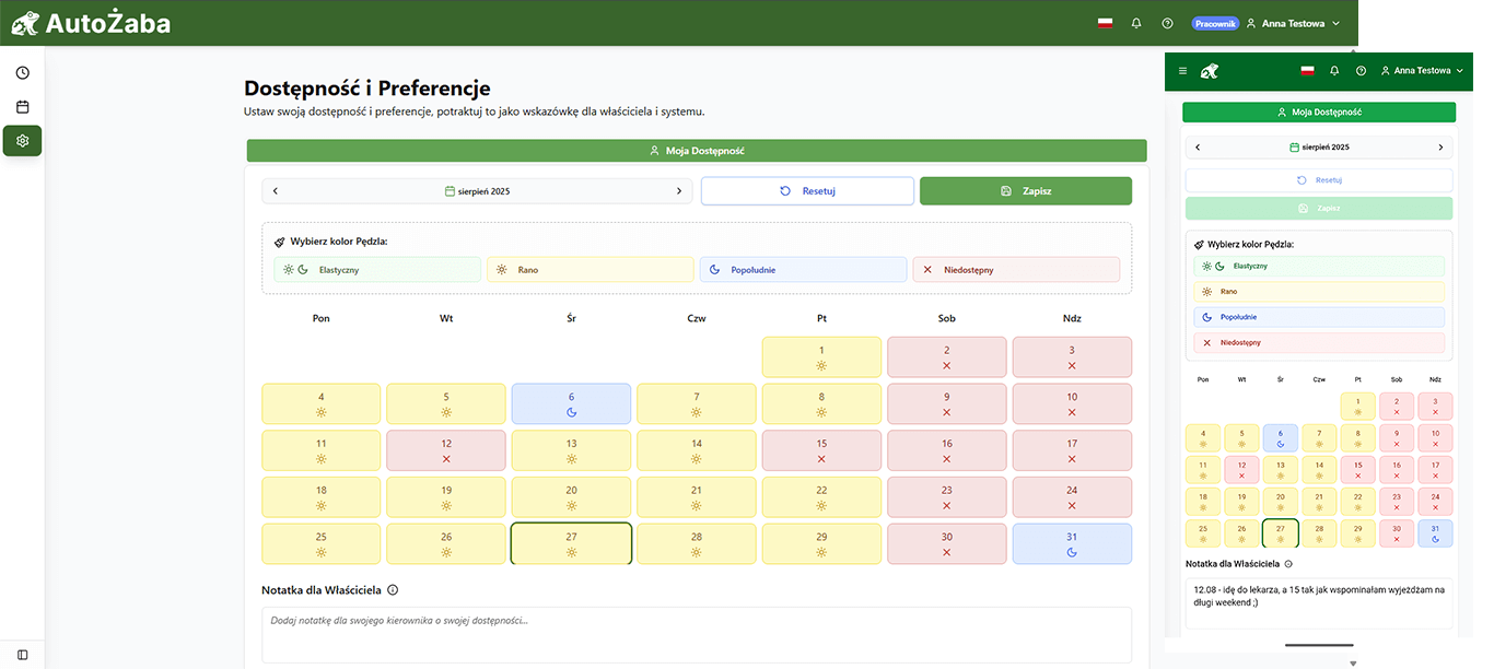 Kalendarz dostępności pokazuje kolory zmian oraz miejsce na krótką notatkę dla właściciela.